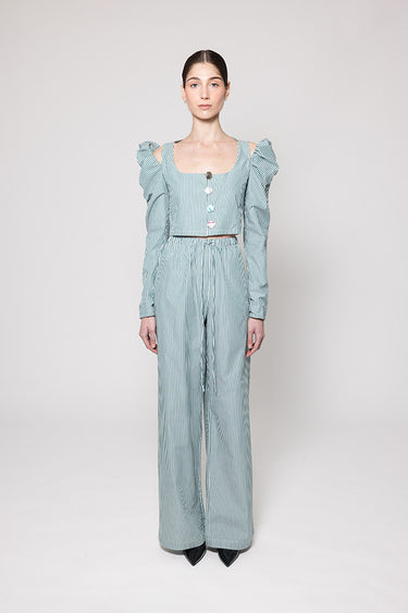 Munirah top, featuring a square neckline, structured puff sleeves, and a cropped silhouette. Designed with a button-front detail and clean lines that create a refined and modern shape.