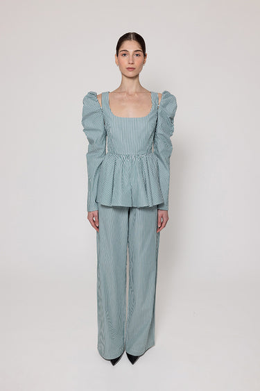 Peplum top, featuring a square neckline and a softly flared peplum waist. Designed with detachable sleeves, allowing the piece to transition from a statement long-sleeve silhouette to a refined sleeveless form.